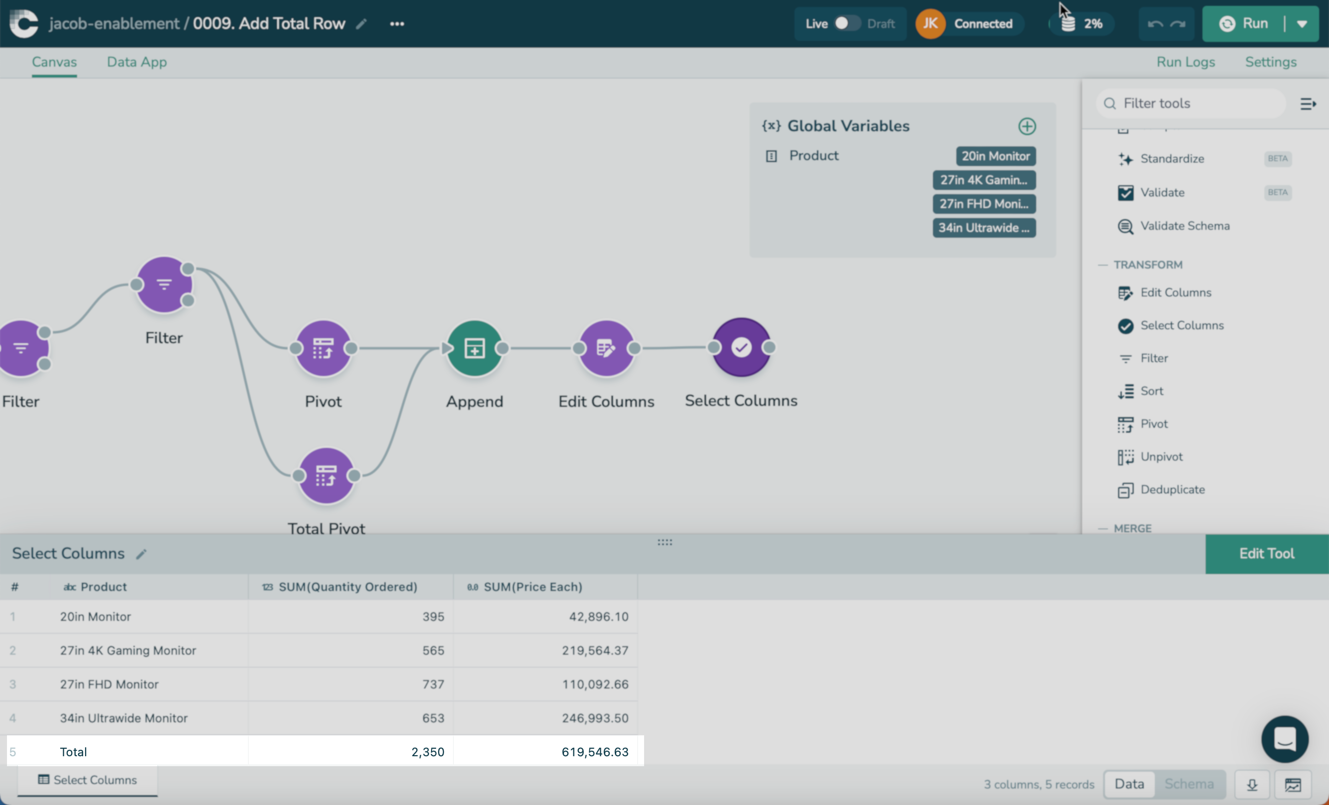 Feel free to use an Edit Columns tool and Select Columns tool to apply the value ‘Total’ at the bottom of the table.