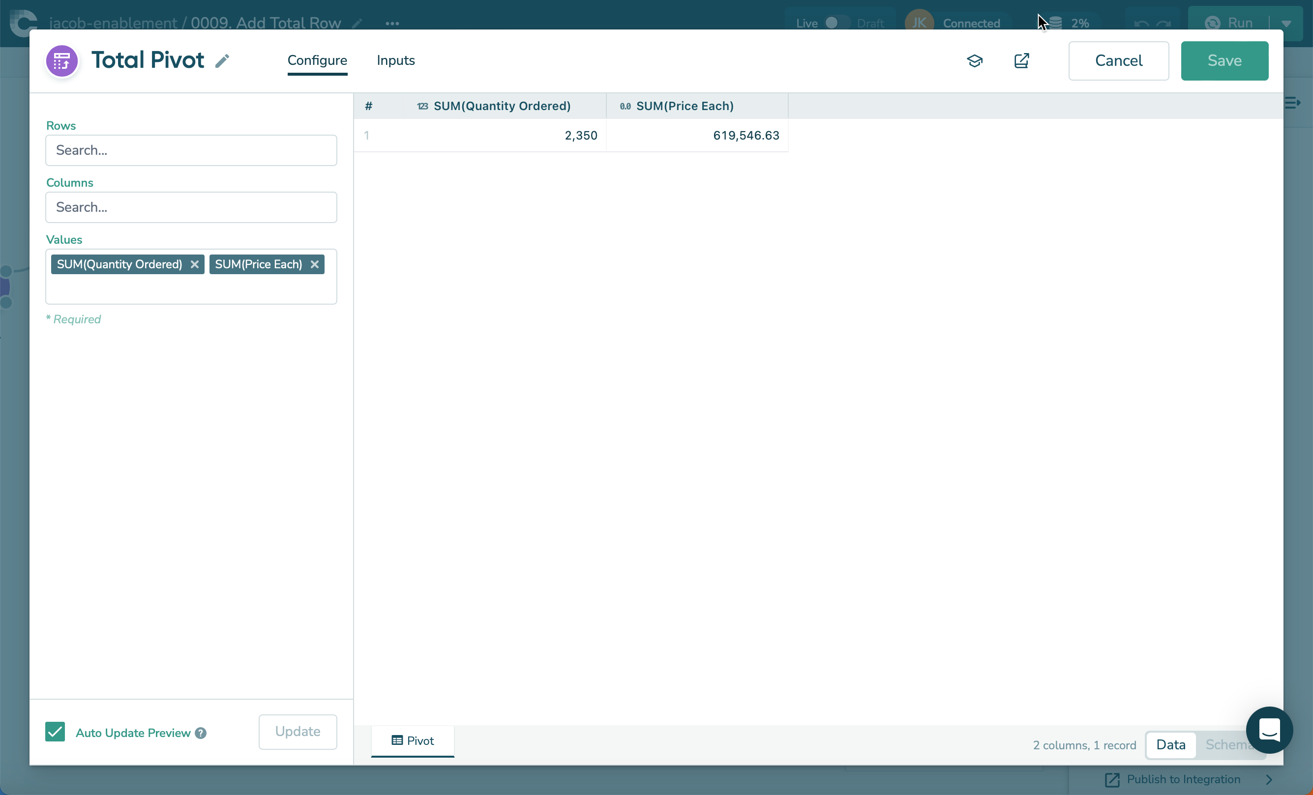 What we might recommend is using a another Pivot tool to sum the entire Quantity Ordered and Price Each fields.