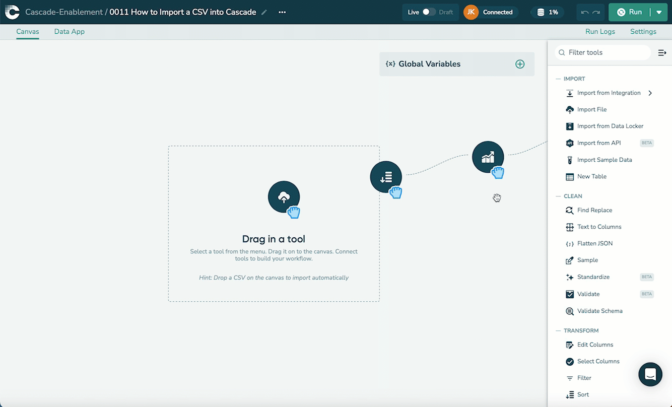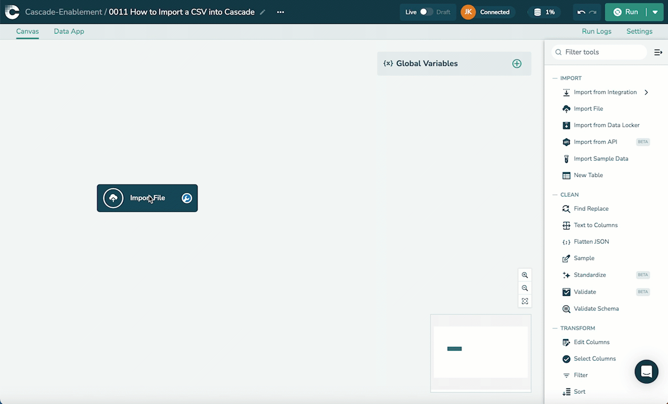 Drag and drop the [Import File](https://docs.cascade.io/cascade/tools/import/import_file) tool onto your workspace.