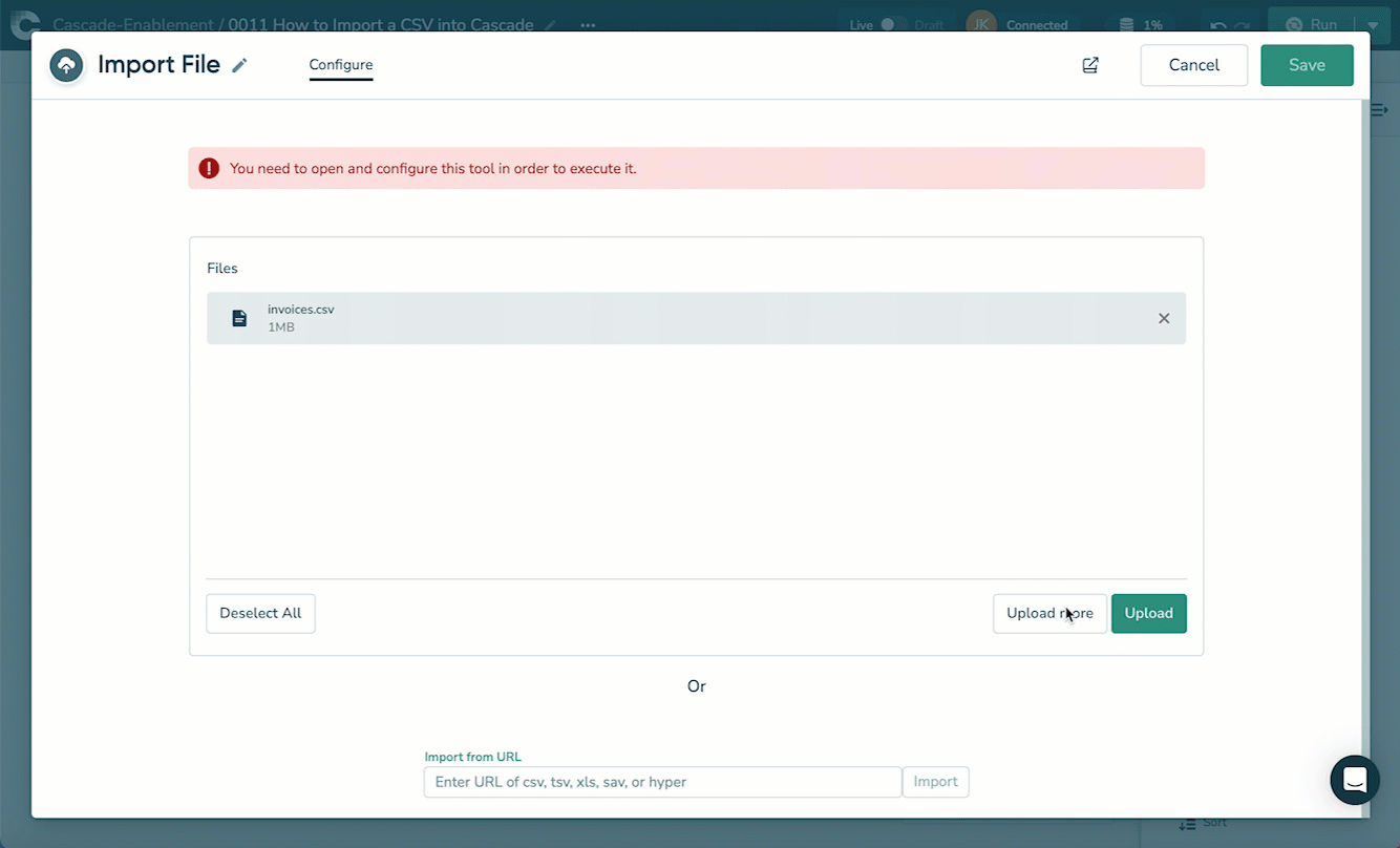 <figure><img src="https://2577551913-files.gitbook.io/~/files/v0/b/gitbook-x-prod.appspot.com/o/spaces%2F-MW_FvcY52Jcyt8JHFGs%2Fuploads%2FYOwmHil60du0e2vda2Ry%2Fimport-csv-to-cascade-2.gif?alt=media&#x26;token=04120663-d5c1-43c3-b3f7-ebf4c68dd434" alt=""><figcaption><p>Open the tool configuration</p></figcaption></figure>