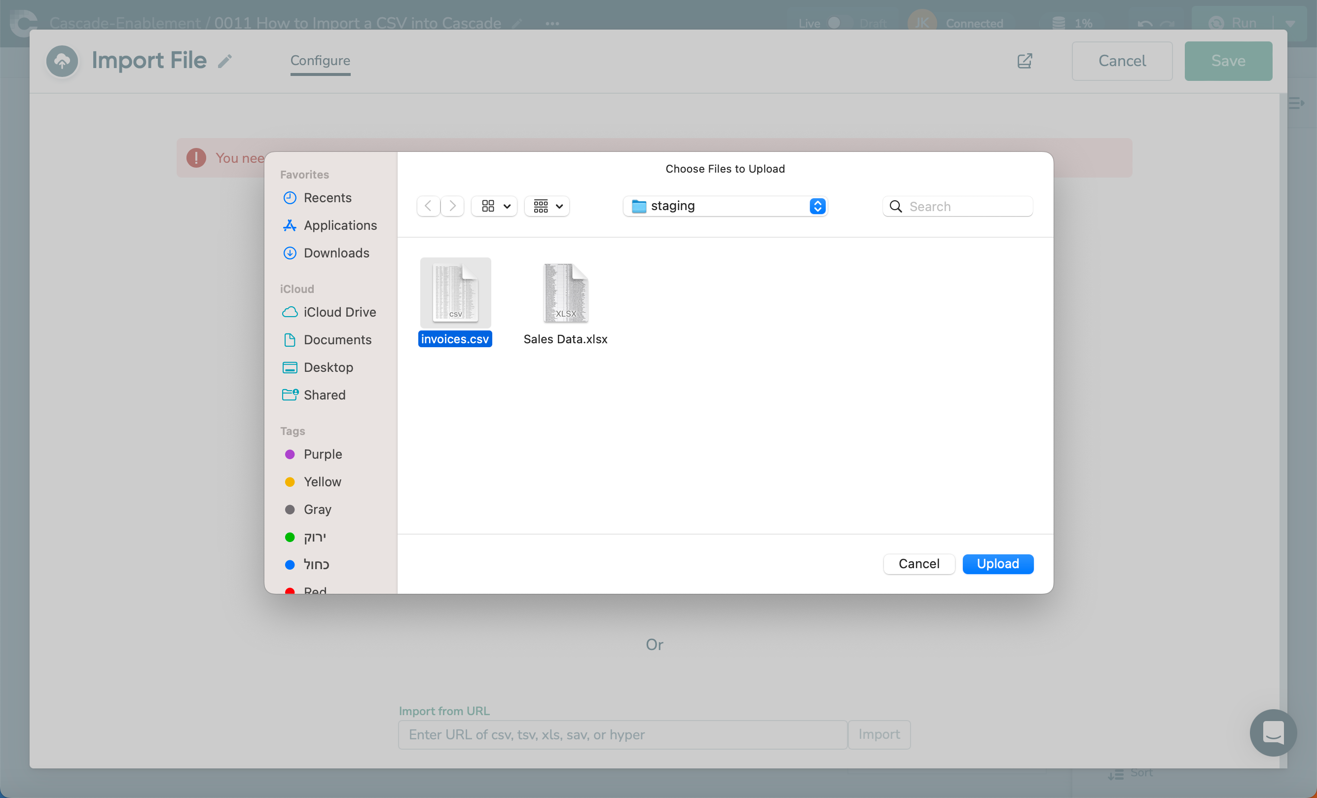 <figure><img src="https://2577551913-files.gitbook.io/~/files/v0/b/gitbook-x-prod.appspot.com/o/spaces%2F-MW_FvcY52Jcyt8JHFGs%2Fuploads%2FRfWSEXeFoCcIE8lfNEzF%2Fimport-csv-to-cascade-4.gif?alt=media&#x26;token=8b1925aa-f1fa-4b41-a2d0-924cfcd90955" alt=""><figcaption><p>Allow the CSV File to upload to Cascade</p></figcaption></figure>