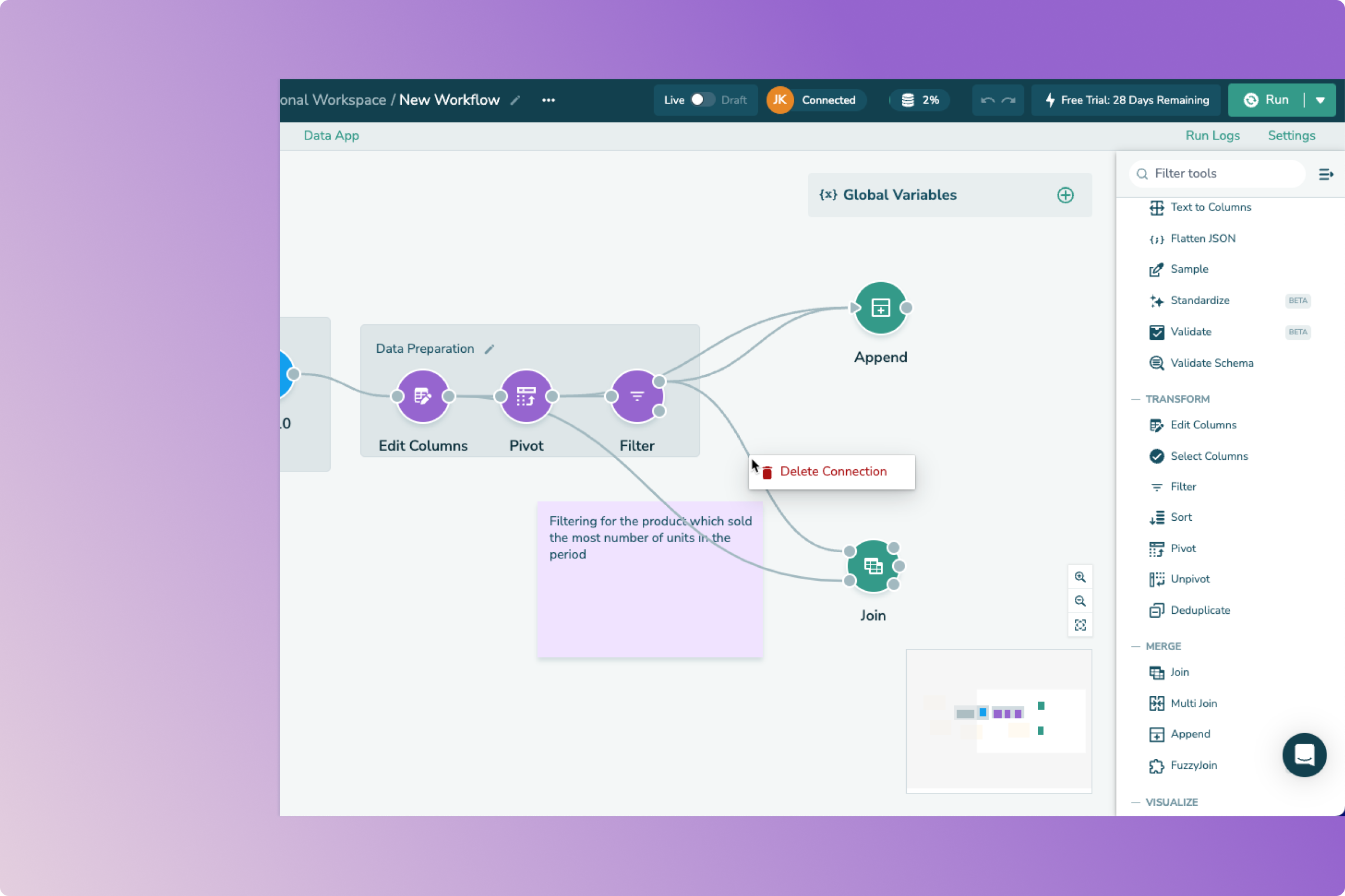 Each tool located in the tool menu performs a distinctive step in your data logic. These steps resemble those undertaken to ready and cleanse data. The tools available all aid in expediting the process, simplifying the workload and ensuring the information is accurately and efficiently organized. They include a range of functions, such as data extraction and transformation, as well as validation and formatting. All of which are essential for ensuring the data is in an ideal condition for analysis and visualization.